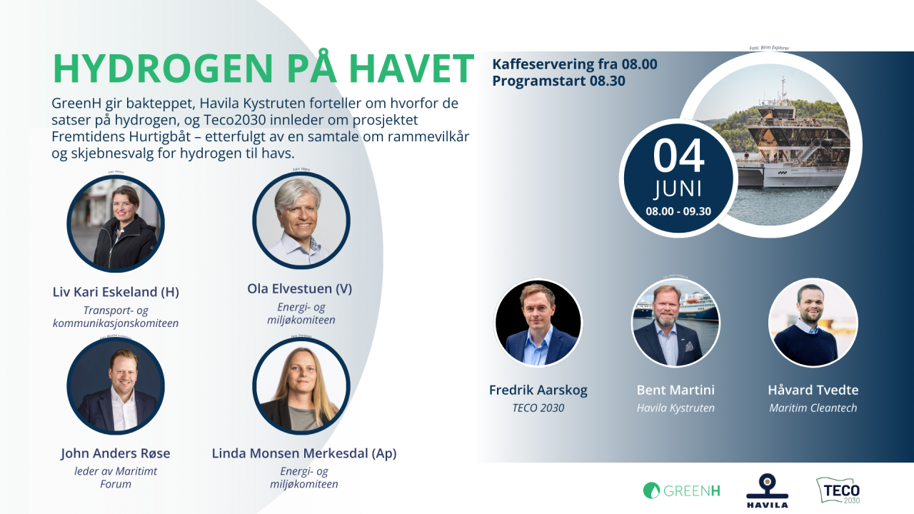 GreenH, Havila Kystruten og Teco2030 vil innlede om status og skjebnevalg for hydrogen på havet, før vi beveger oss inn på politikken med stortingsrepresentanter og Maritimt Forum under siste del av arrangementet.
